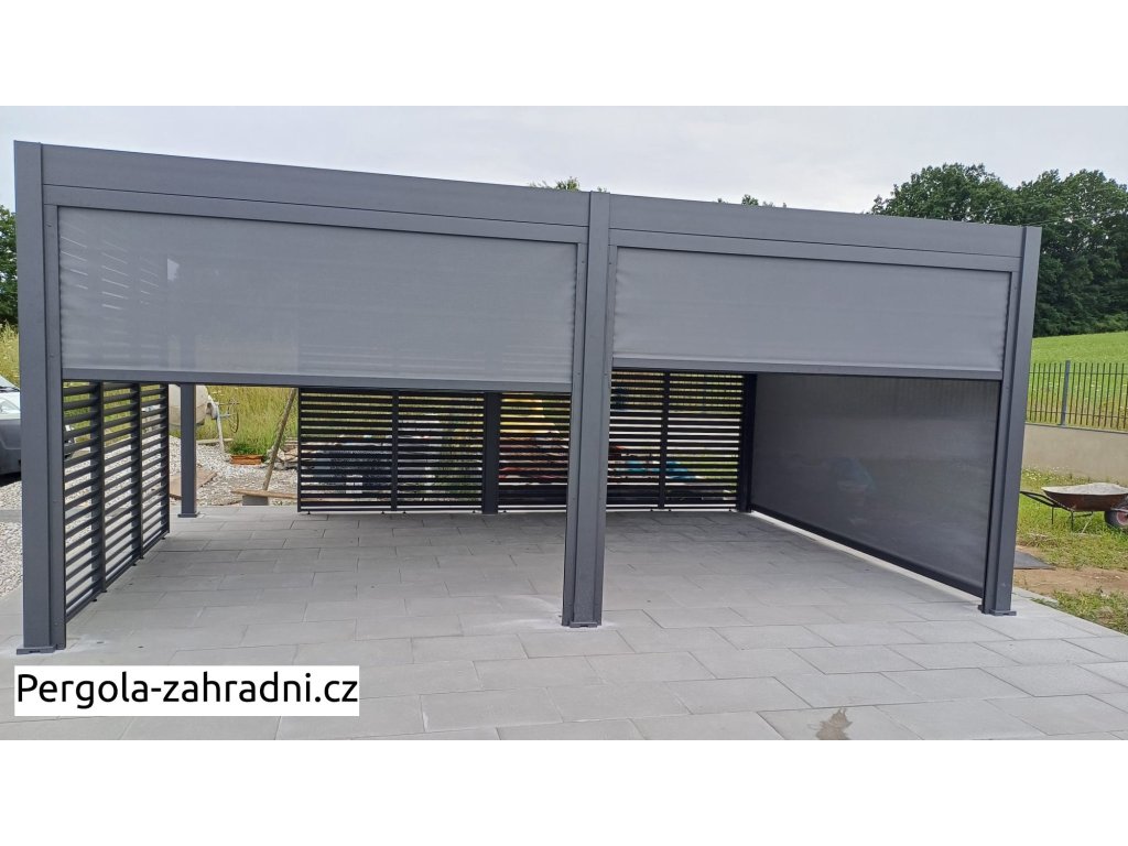 Kteroukoliv stranu pergoly lze doplnit o zástěnu. V nabídce máme třímetrové a čtyřmetrové zástěny s hliníkovou konstrukcí a výplní z textilenu, které poskytnou ochranu před větrem a zároveň vytvoří příjemný stín. Pergolu je také možné doplnit o stínicí panely s fixními či sklápěcími horizontálními lamelami pro dodatečné soukromí a zastínění.