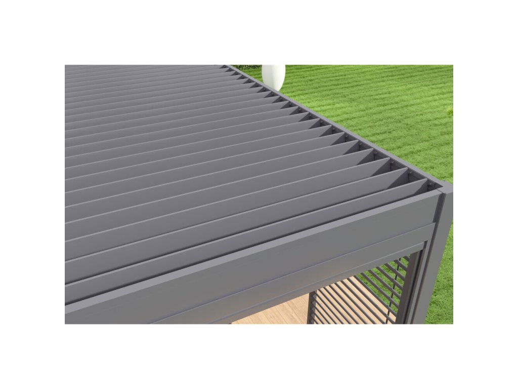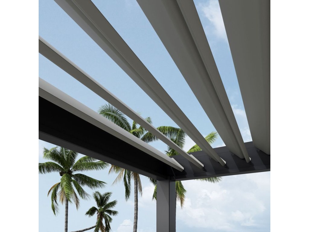 25 nastavitelných otočných dvojitých lamel (dvě vrstvy s dutým vnitřkem) Vás ochrání nejen před sluncem, ale i před deštěm. Lamely lze otáčet od 0°, kdy docílíte úplně uzavřené střechy až do 135°, díky čemuž získáte skvělou mobilitu a možnost zastínit slunce z jakékoliv strany.