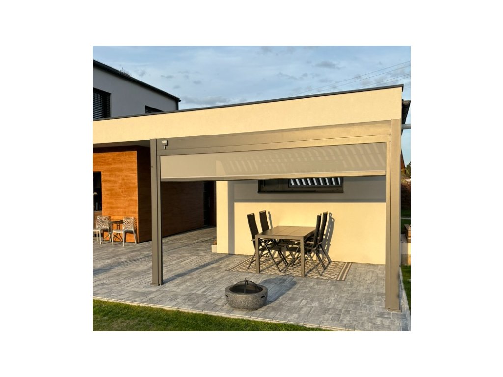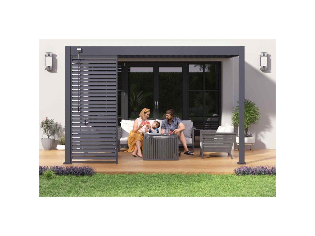 Pergolu lze doplnit o přední zástěnu. V nabídce máme čtyřmetrové zástěny s hliníkovou konstrukcí a výplní z textilenu, které poskytnou ochranu před větrem. Pergolu je také možné doplnit o stínicí panel s fixními horizontálními lamelami pro dodatečné soukromí a zastínění. Panely lze použít na všech stranách pergoly a v případě bočního kotvení lze rám panelu přivrtat do stěny.