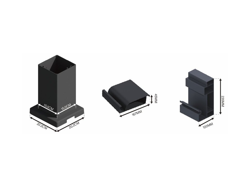 Robustní sloupek má rozměry 150x150 mm, při instalaci je zapotřebí počítat s patkou sloupku o rozměrech 160x160 mm. Patka je z 8 mm silné oceli a je navíc zakryta hliníkovým krytem ( mm) s integrovaným drenážním systémem. Vyvýšený hliníkový profil s přidanou horní lištou ukrývá lamely tak, že z bočního pohledu nejsou viditelné a jsou v jedné linii s profilem.