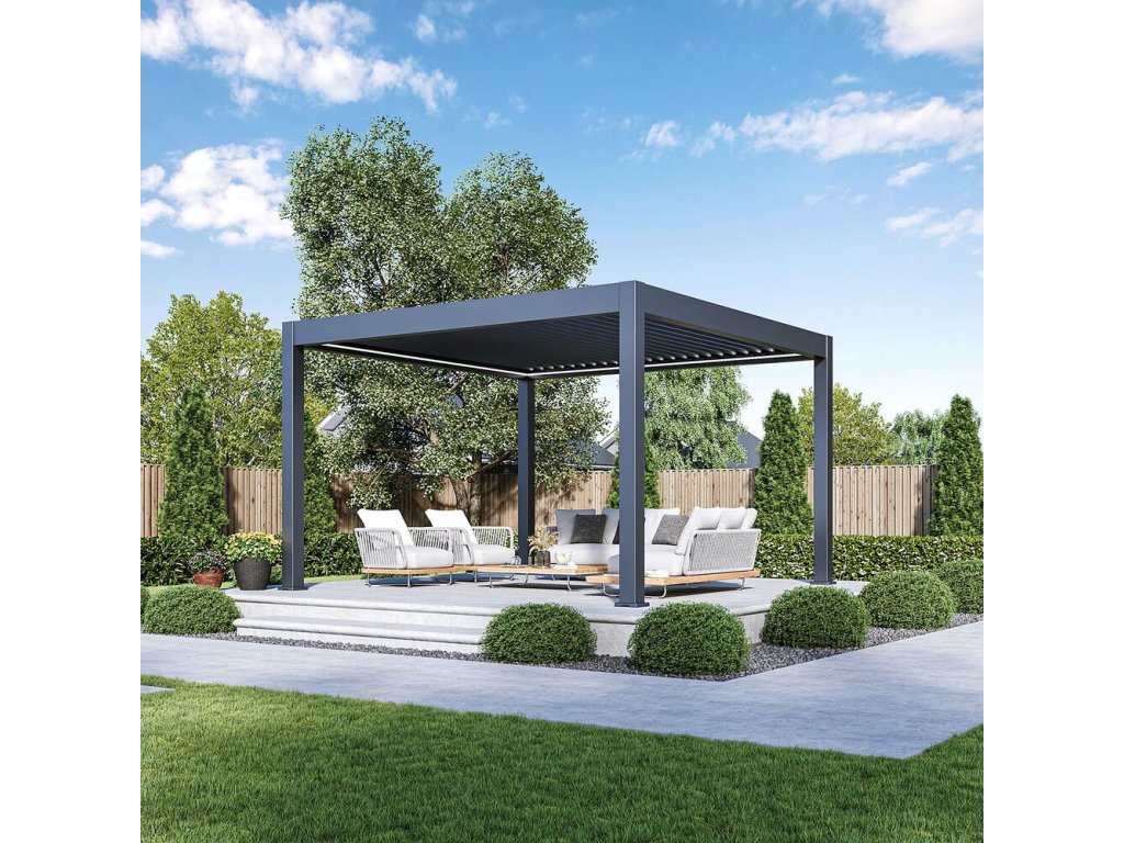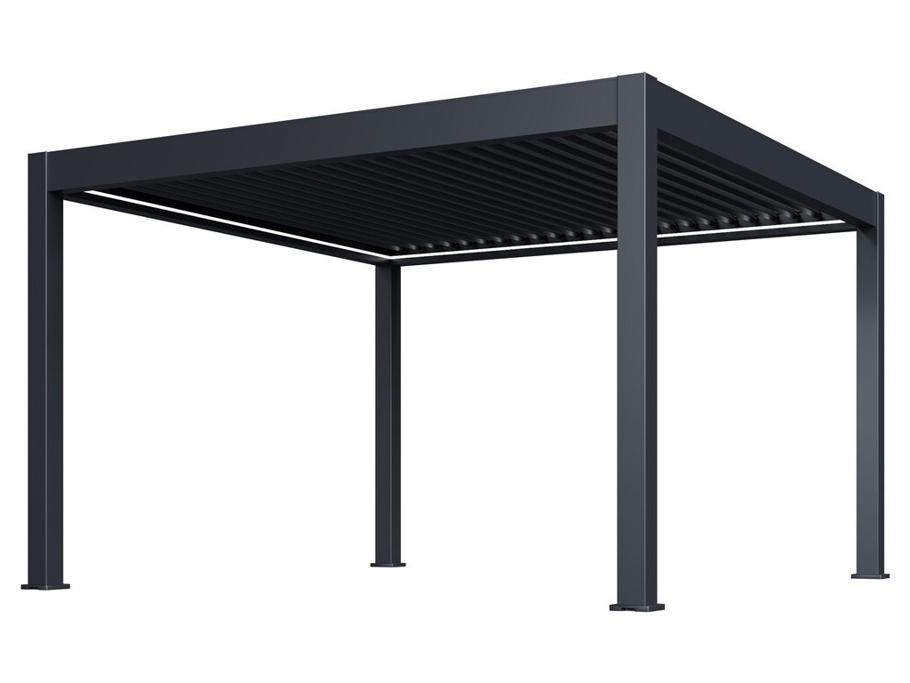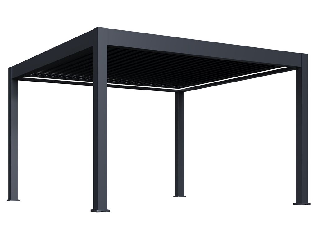 Luxusní zahradní hliníková volně stojící bioklimatická pergola o rozměrech 4x4 metry s ELEKTRICKÝM POHONEM pro otáčení lamel a LED OSVĚTLENÍM představuje ideální způsob zastřešení Vašeho venkovního posezení.
